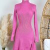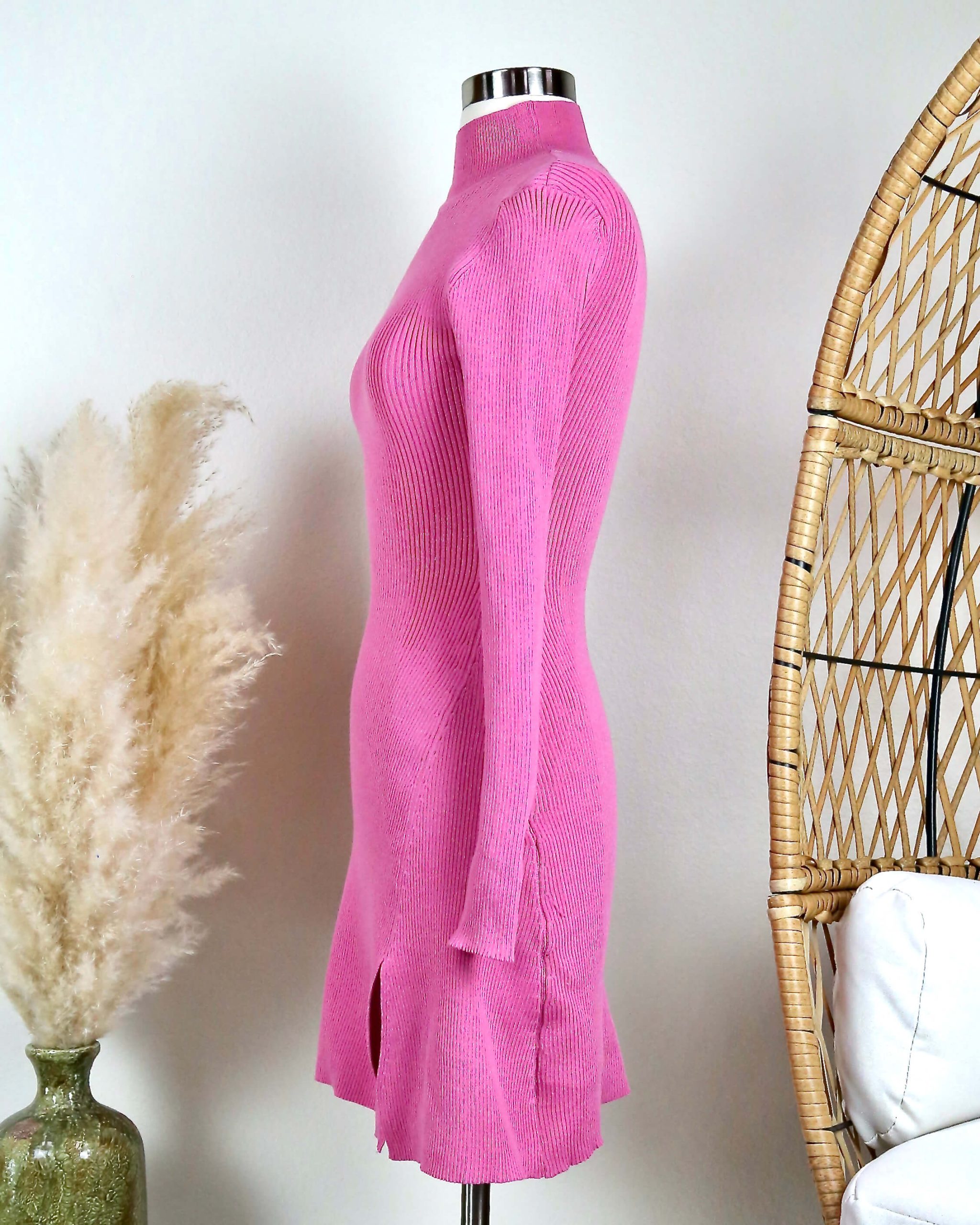 This gorgeous magenta toned dress features a mock neck, long sleeves, and a subtle side slit to further feminize this cute dress.