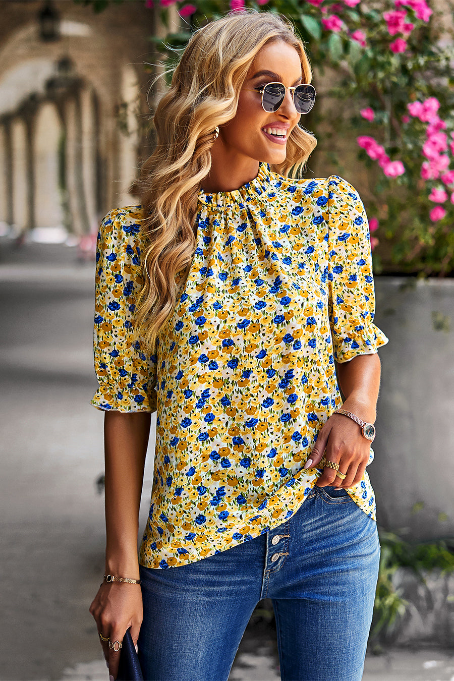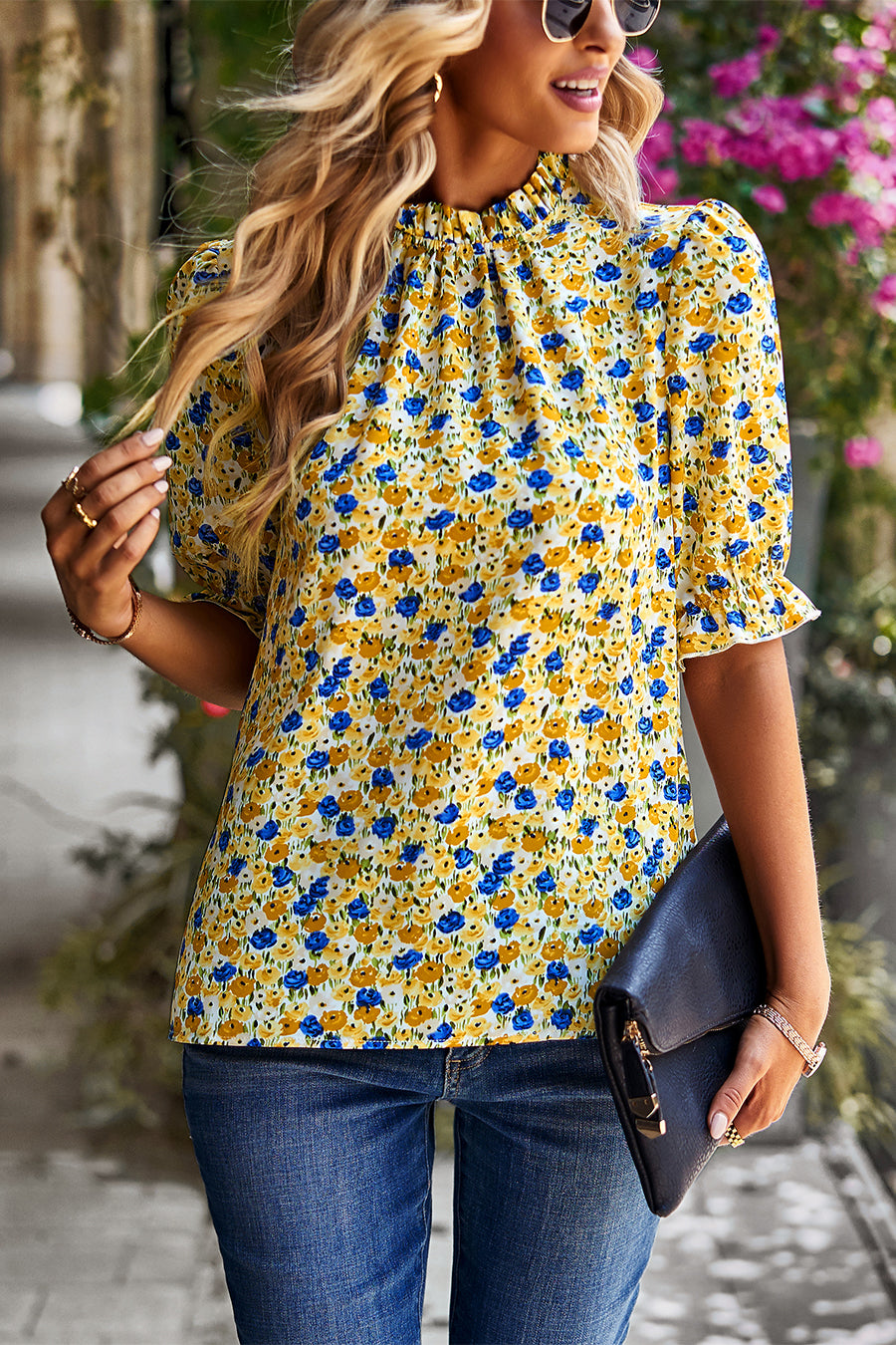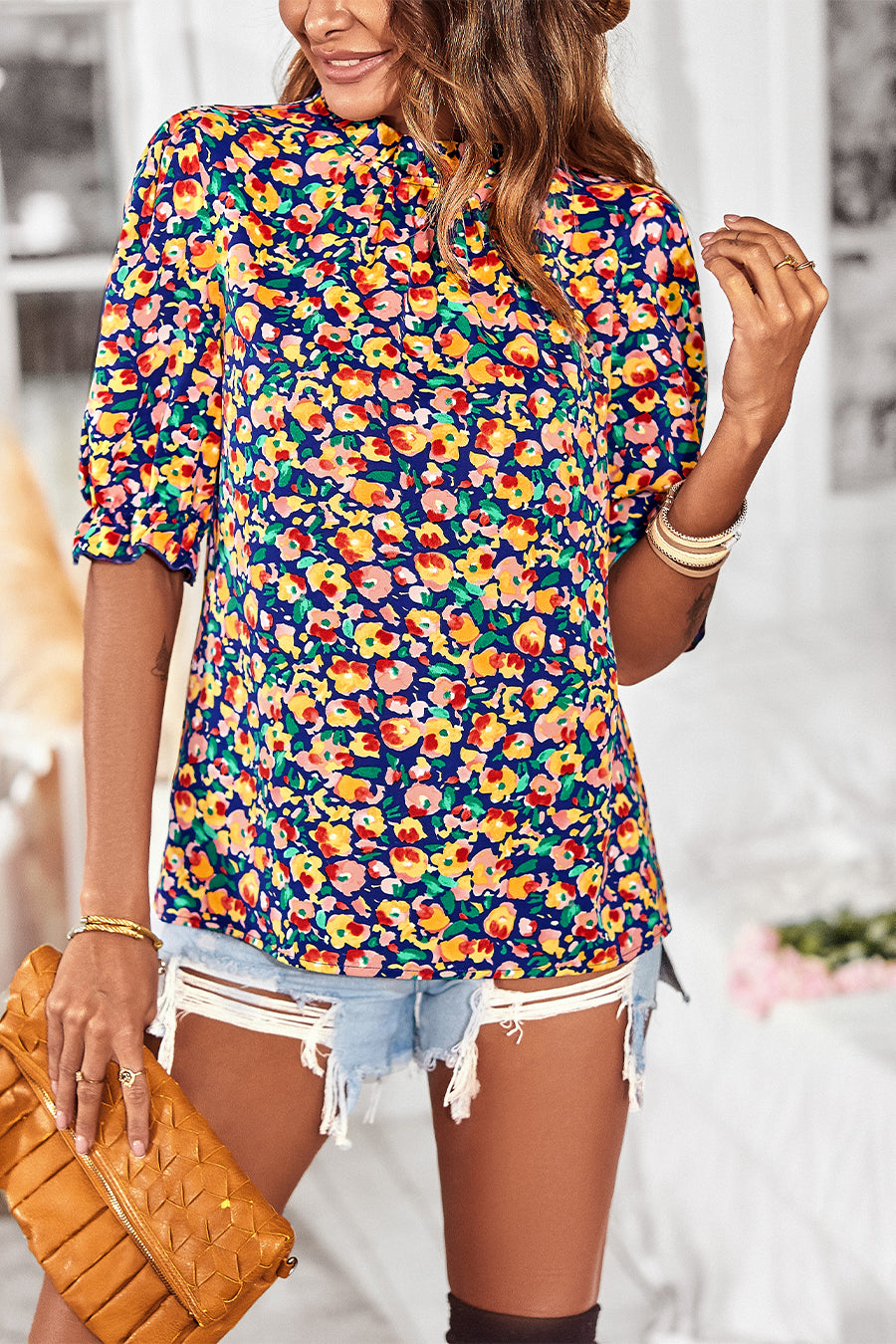 Mock Neck Colorful Floral Short Sleeve Top quantity