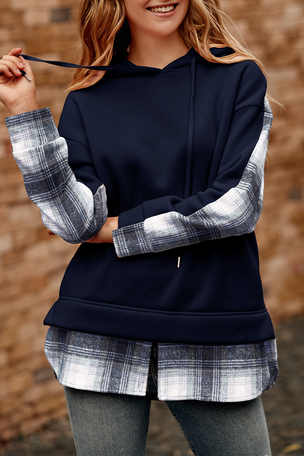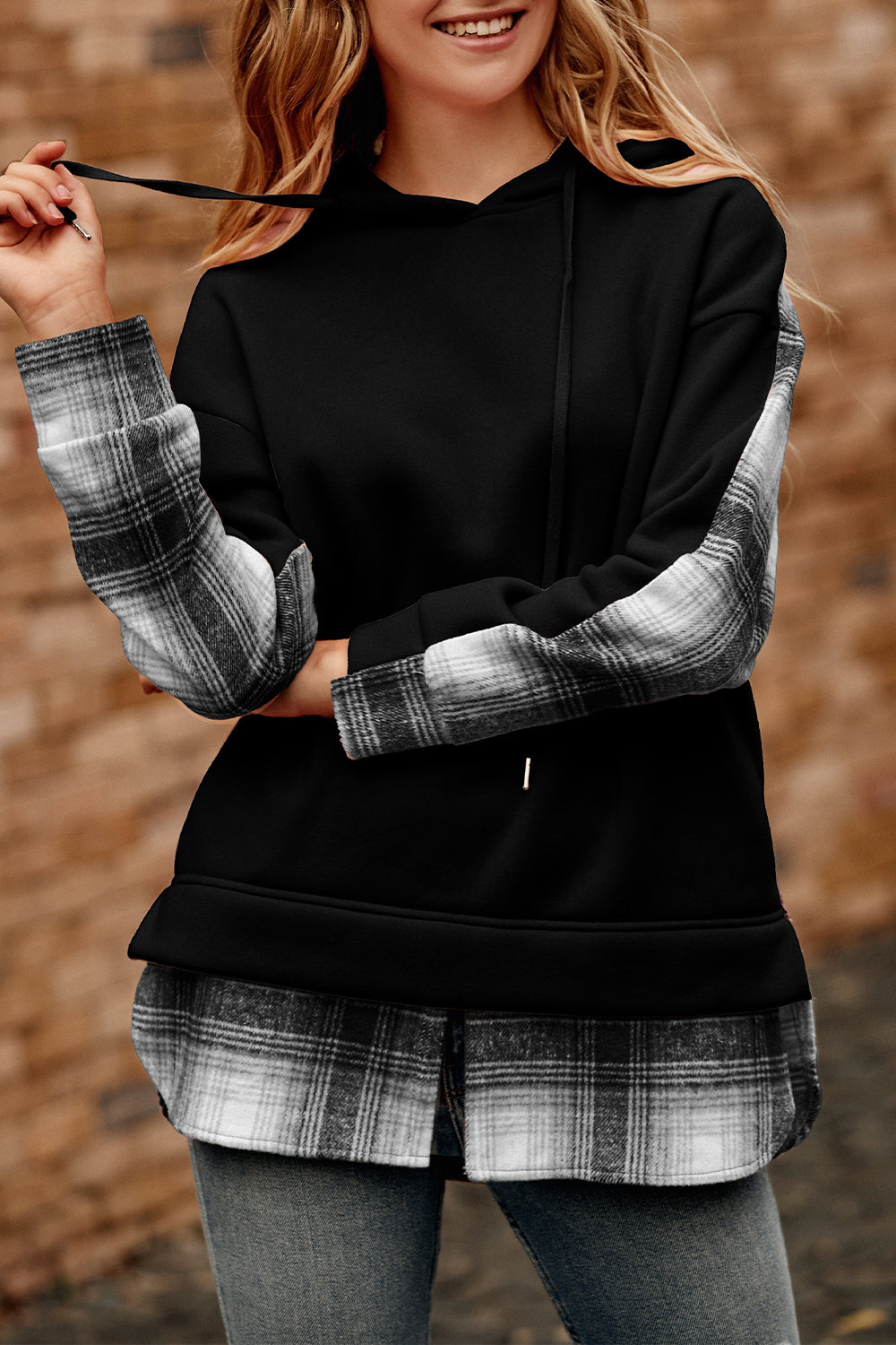 Color Block Plaid Patchwork Hooded Sweatshirt quantity