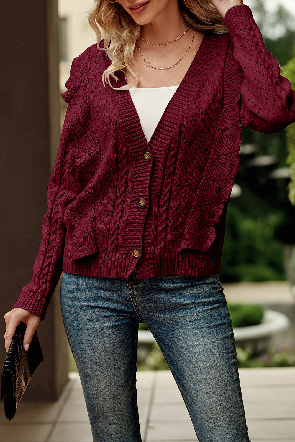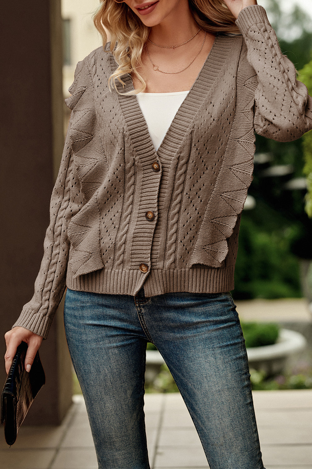 Ruffle Cropped Button Down Knitted Cardigan quantity