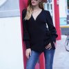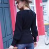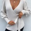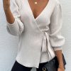 Sexy V Neck Balloon Sleeve Ribbed Wrap Knit Pullover Sweater