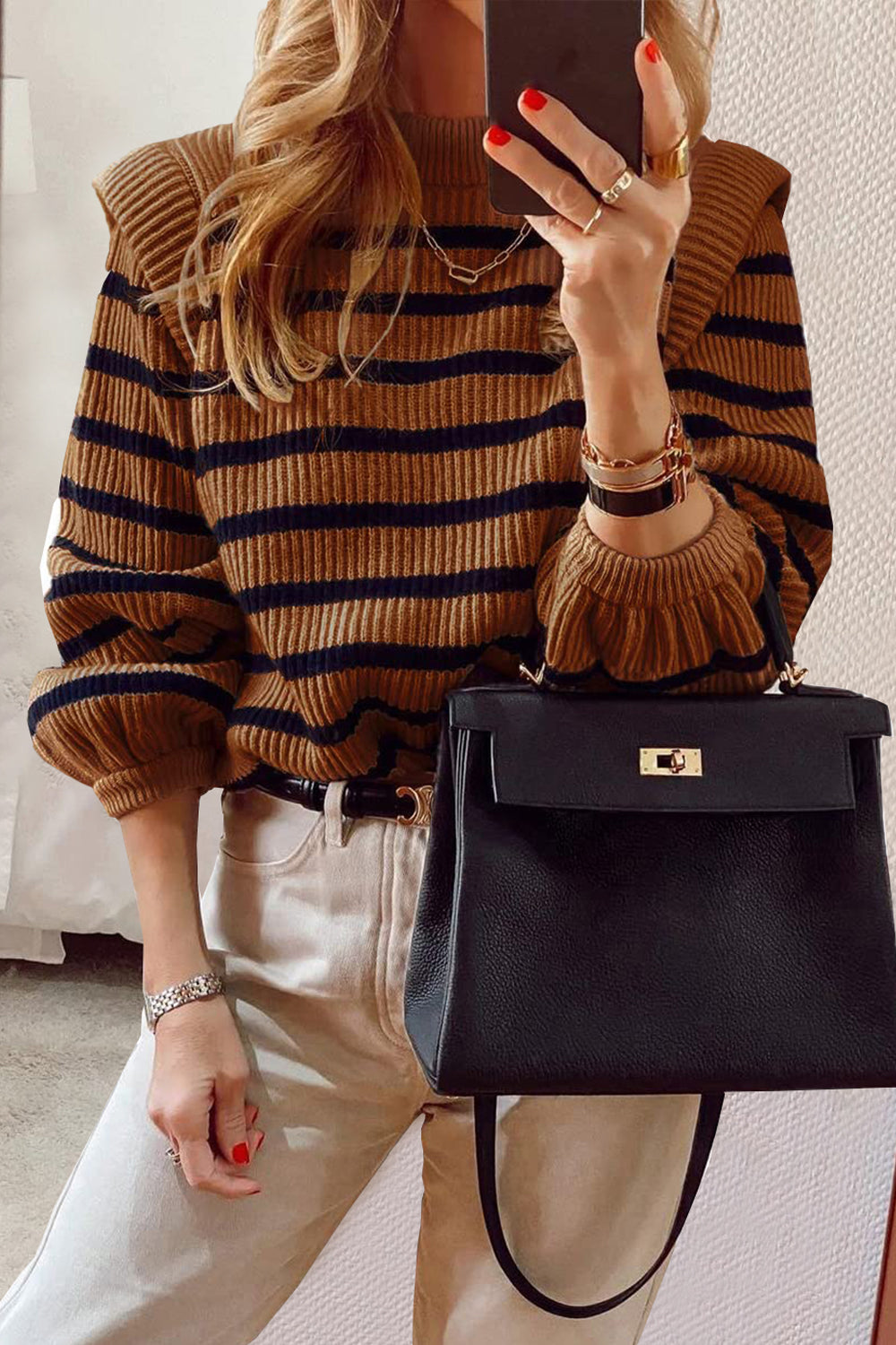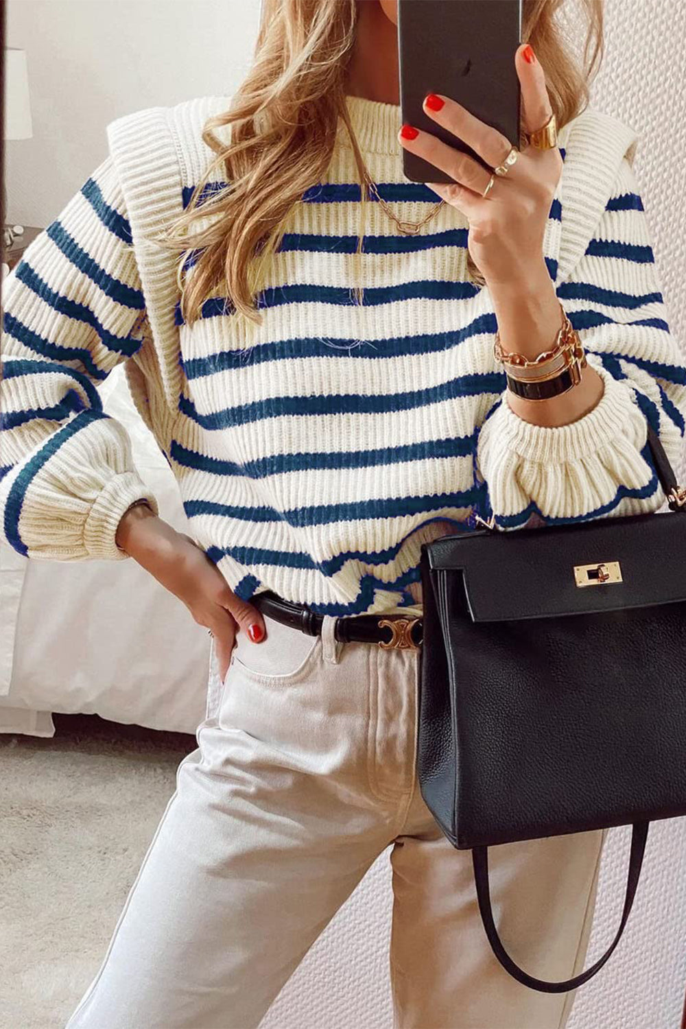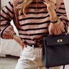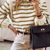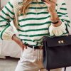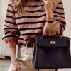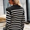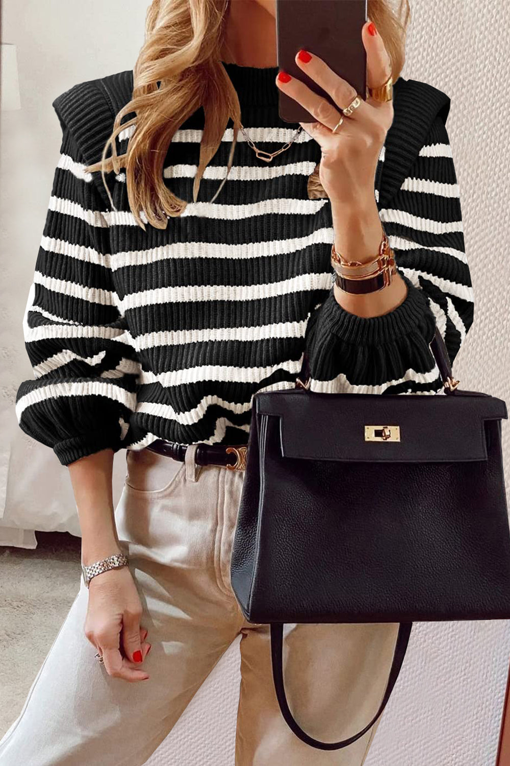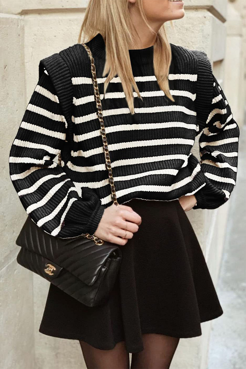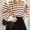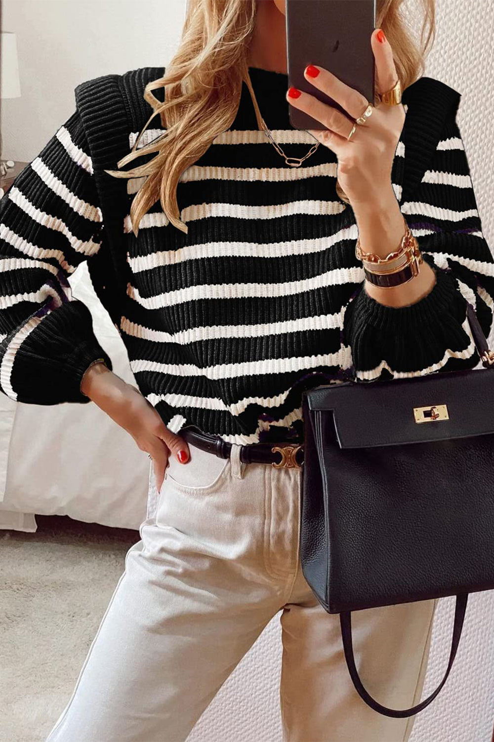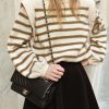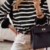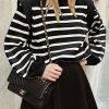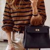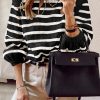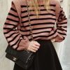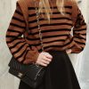 Long Lantern Sleeve Striped Ribbed Knit Pullover Top