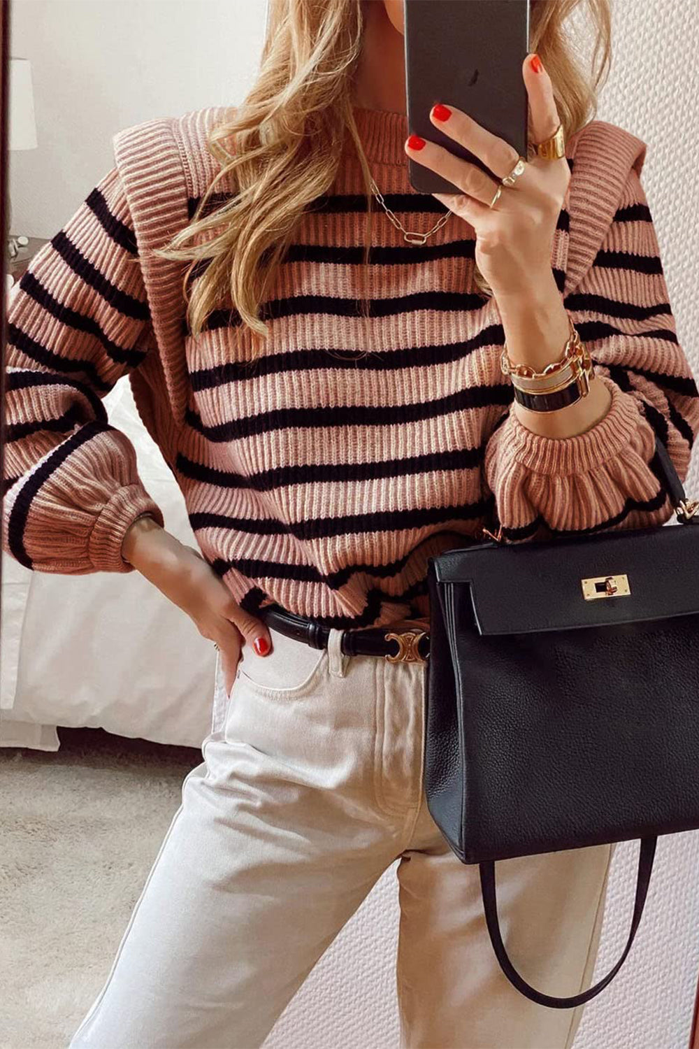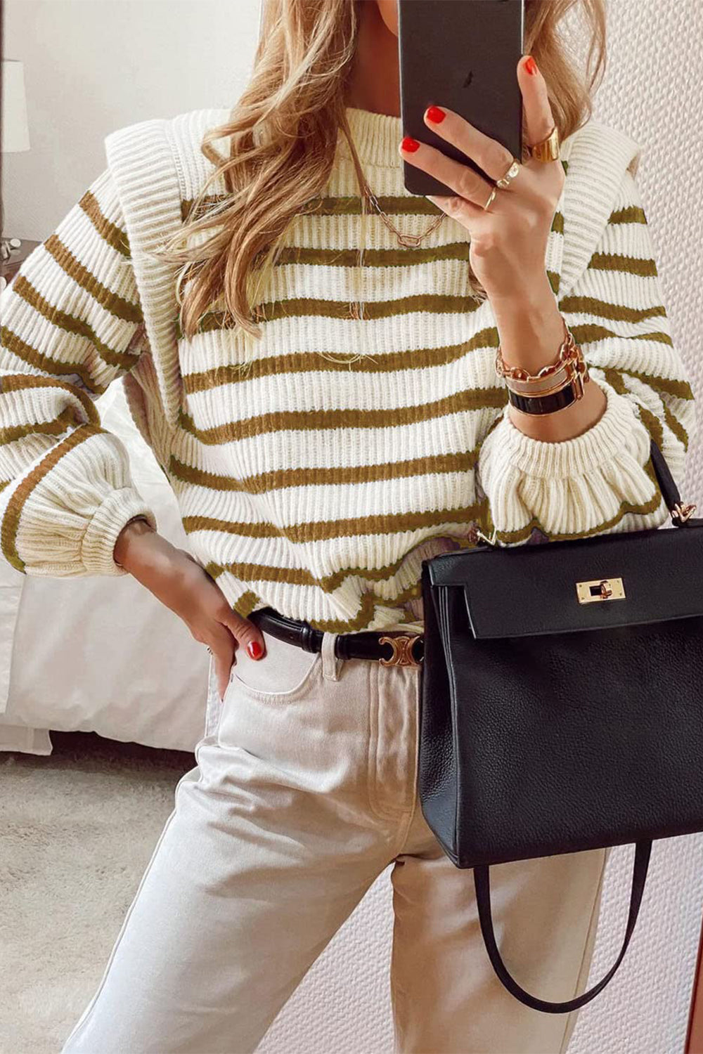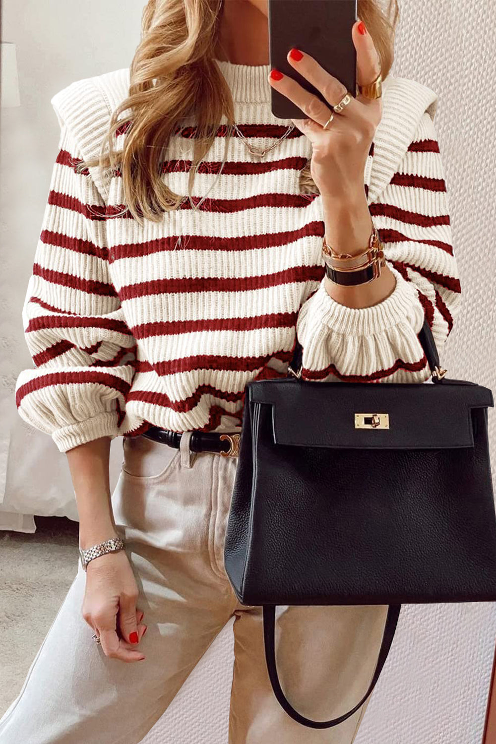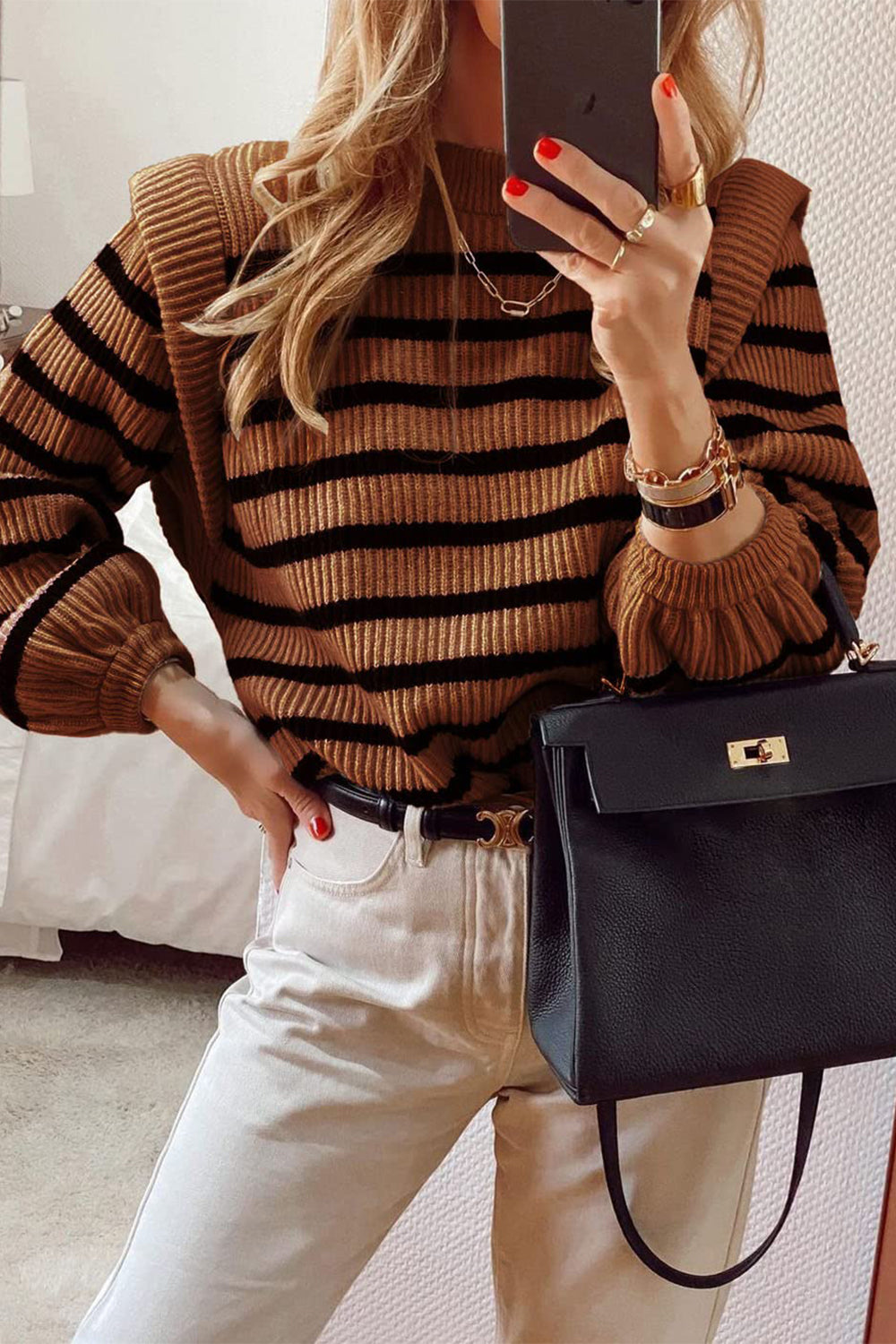 Long Lantern Sleeve Striped Ribbed Knit Pullover Top