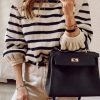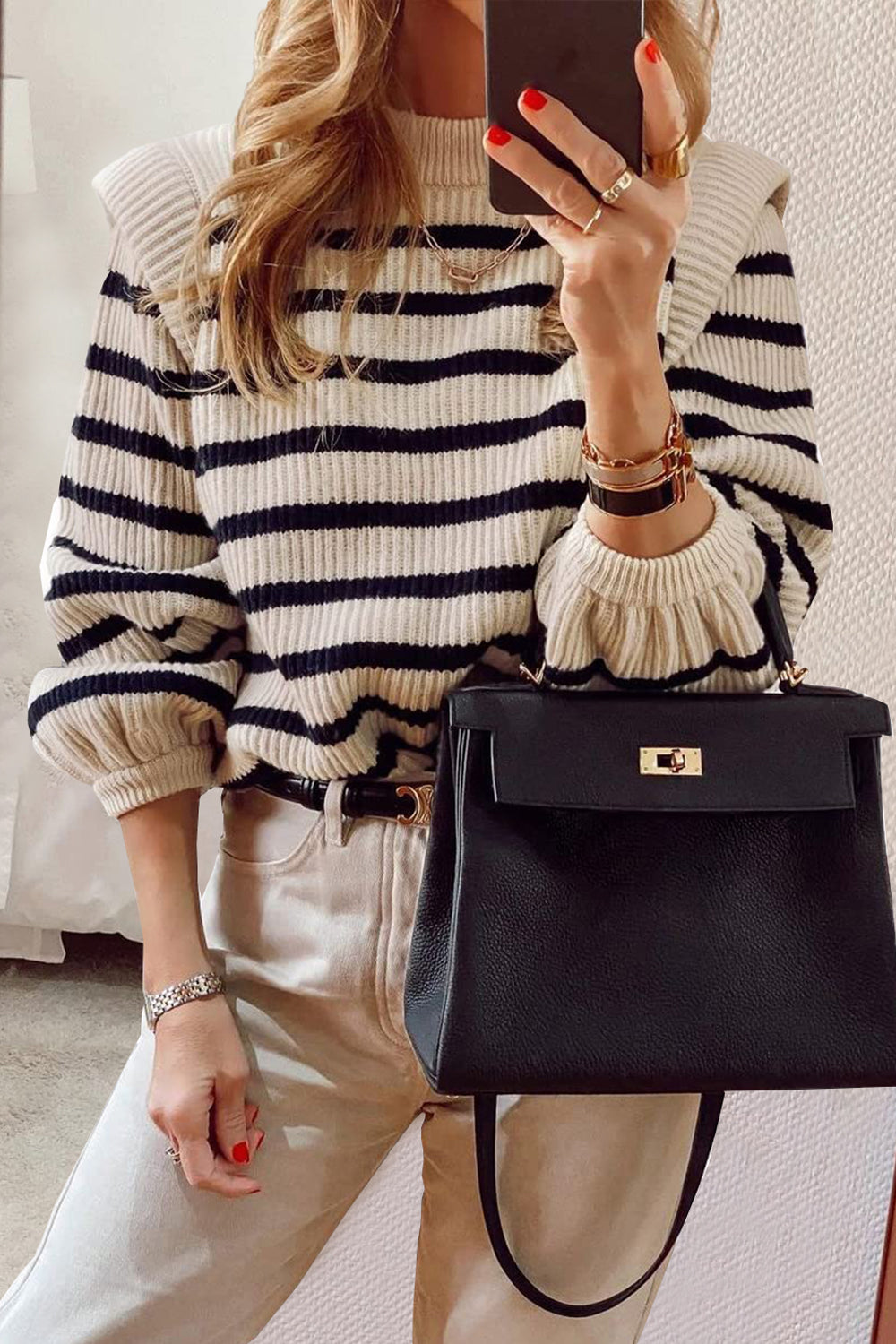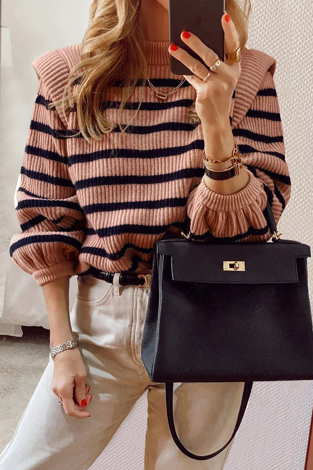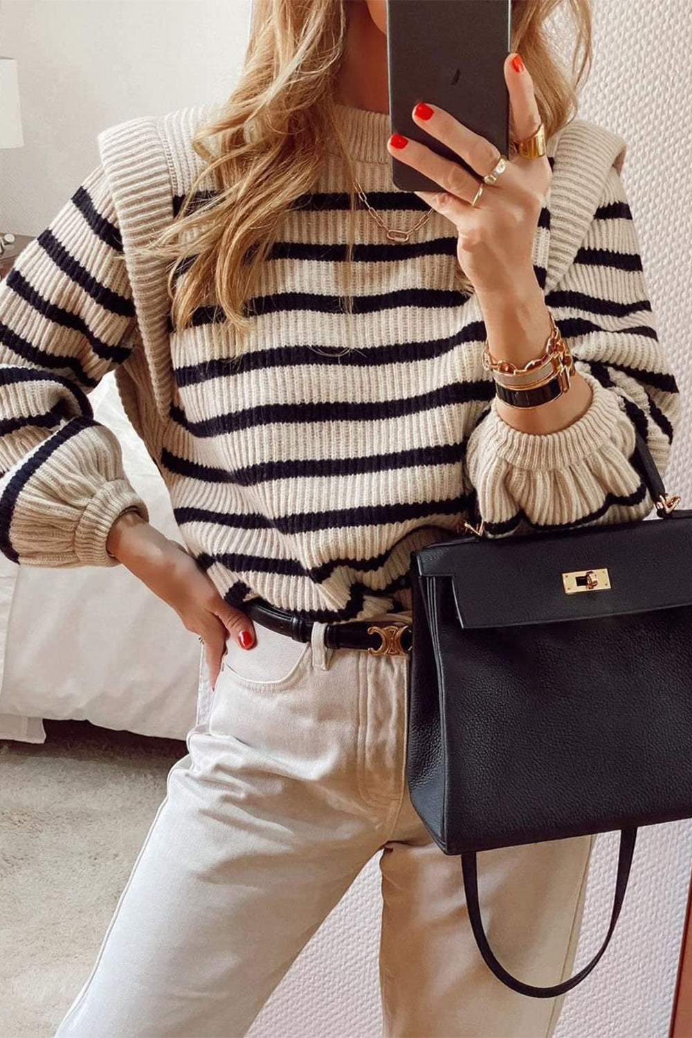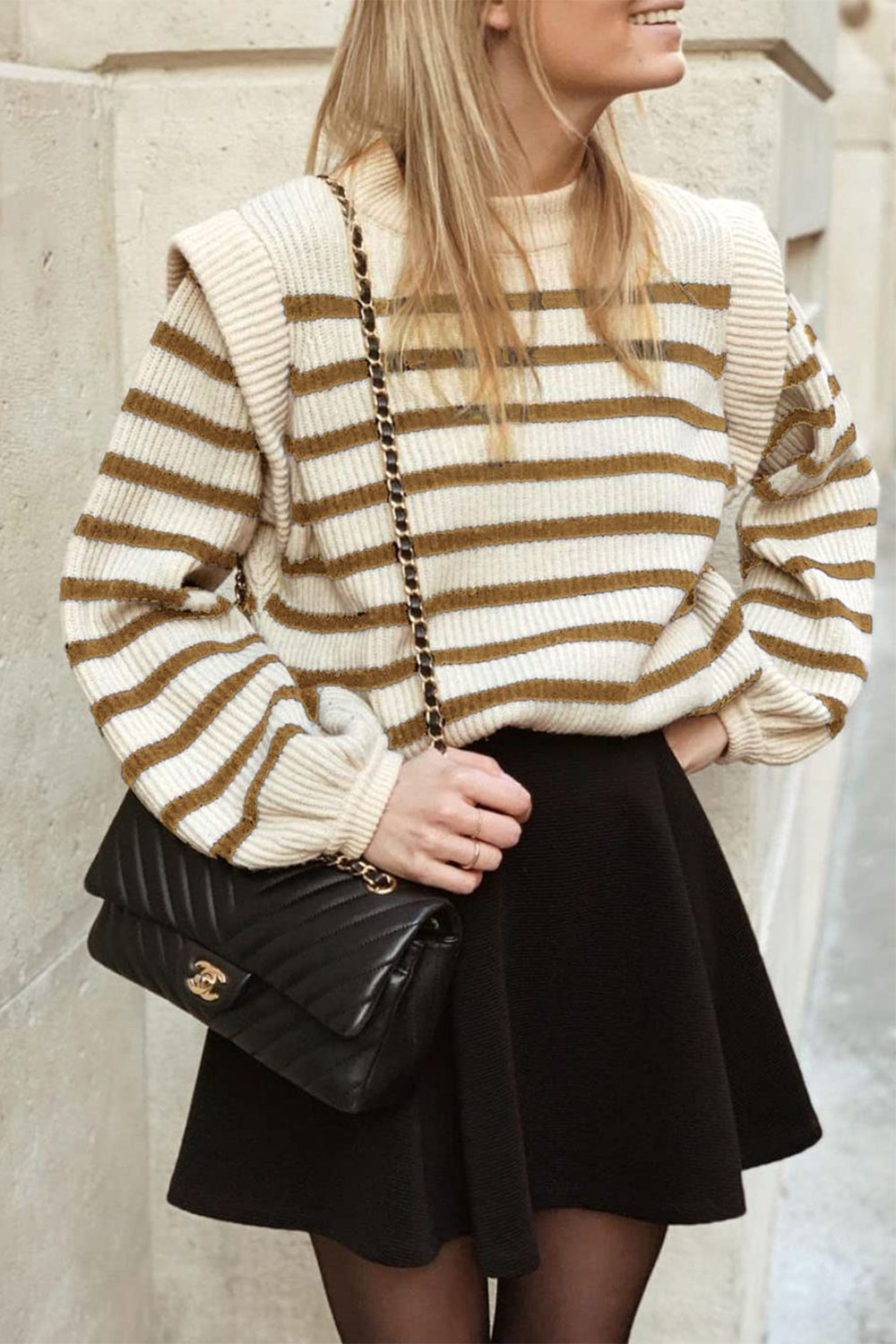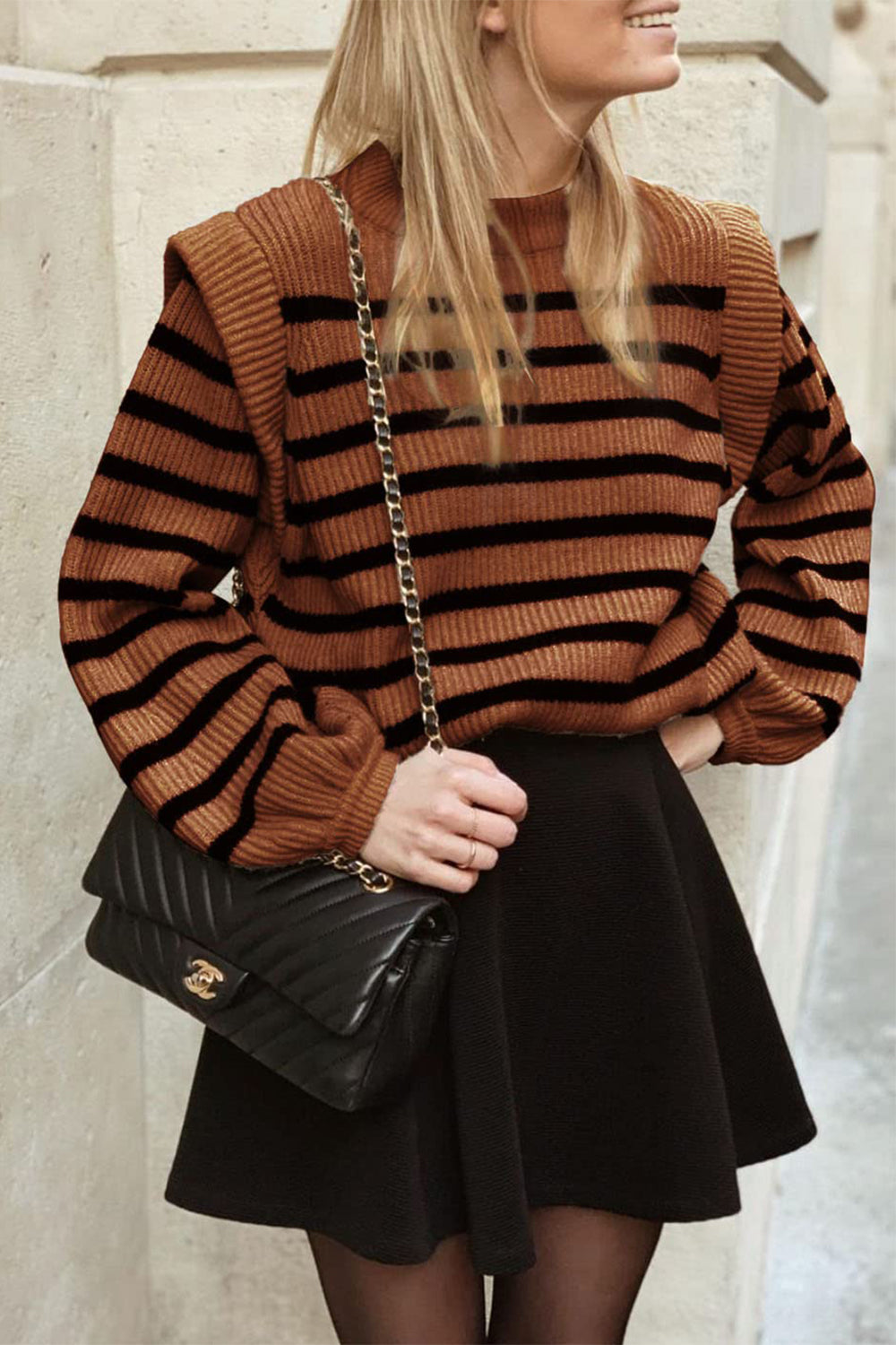 Long Lantern Sleeve Striped Ribbed Knit Pullover Top